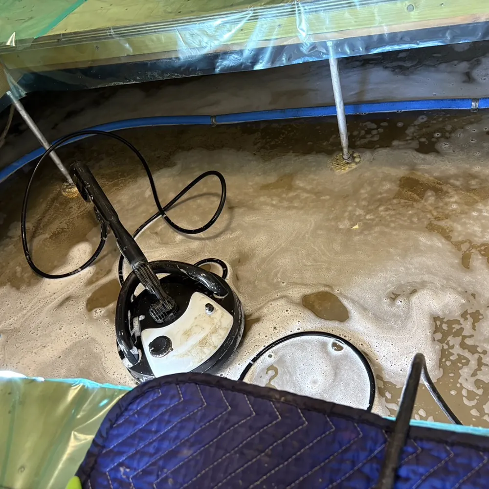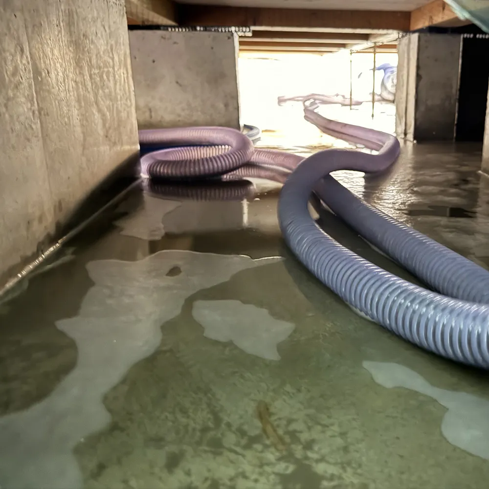 床下全域に滞留した汚水・汚泥を強力バキュームで徹底的に吸引除去。基礎で区切られた両区画それぞれに対して、残水ゼロを目指して排水作業を実施しました。