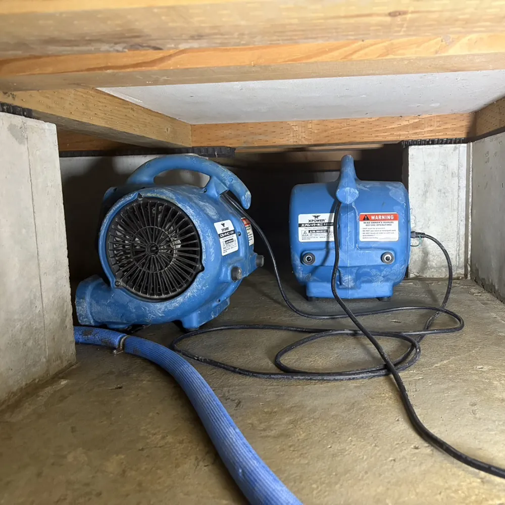 除湿乾燥機からビニールダクトを2本引き、2区画の床下それぞれに乾燥空気を送り込みます。含水率計で基礎・木部を定期的に測定し、適正値に達するまで計画的に乾燥を継続しました。