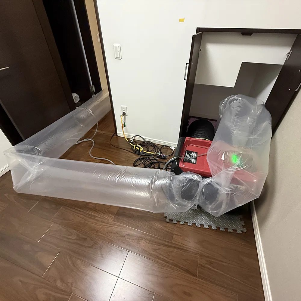- 対応内容:畳開口 → バキューム排水 → 高圧バイオ洗浄 → 除湿乾燥(ダクト2本・含水率管理) → 消毒・防カビ → オゾンガス燻蒸