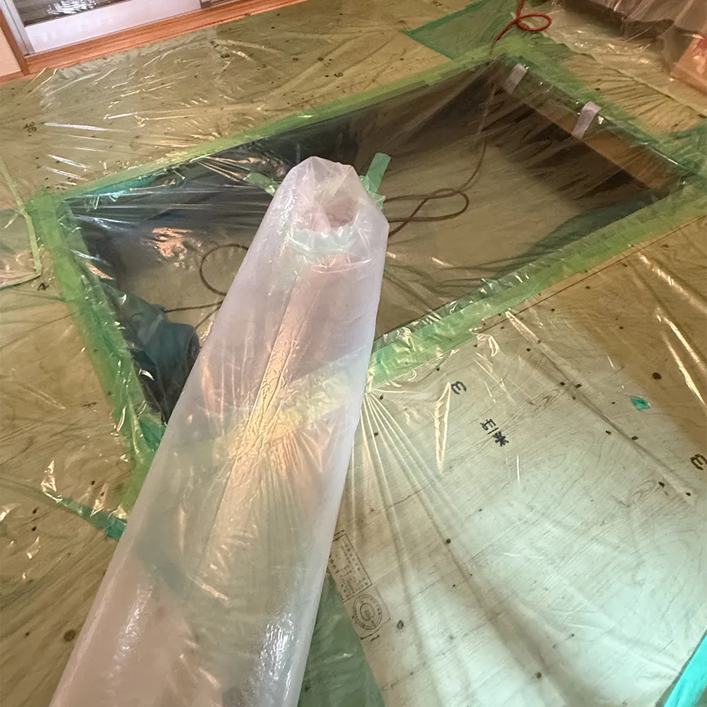 - 特記事項:床下基礎が2区画に分離。和室畳を開口し、ダクト2本で両区画へ乾燥空気を供給