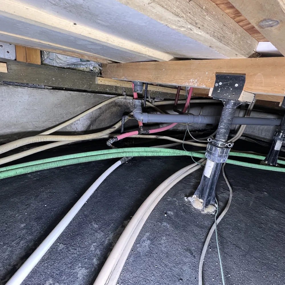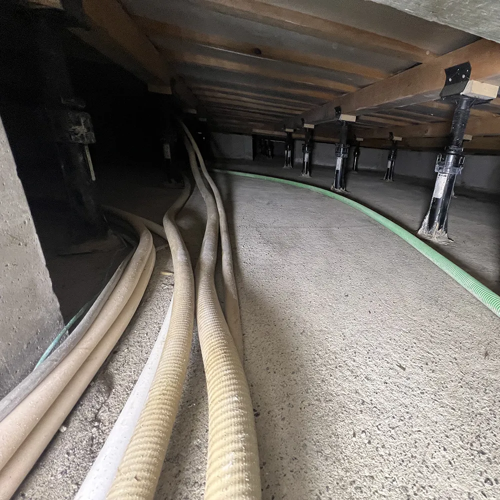 床下に滞留した汚水・汚泥を回収し、悪臭・害虫・二次汚染の原因を先に除去します。