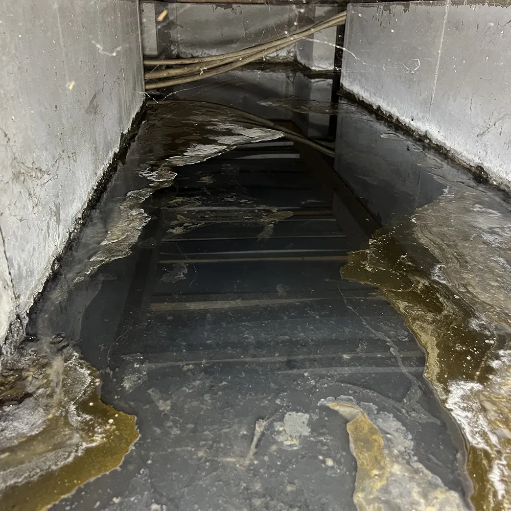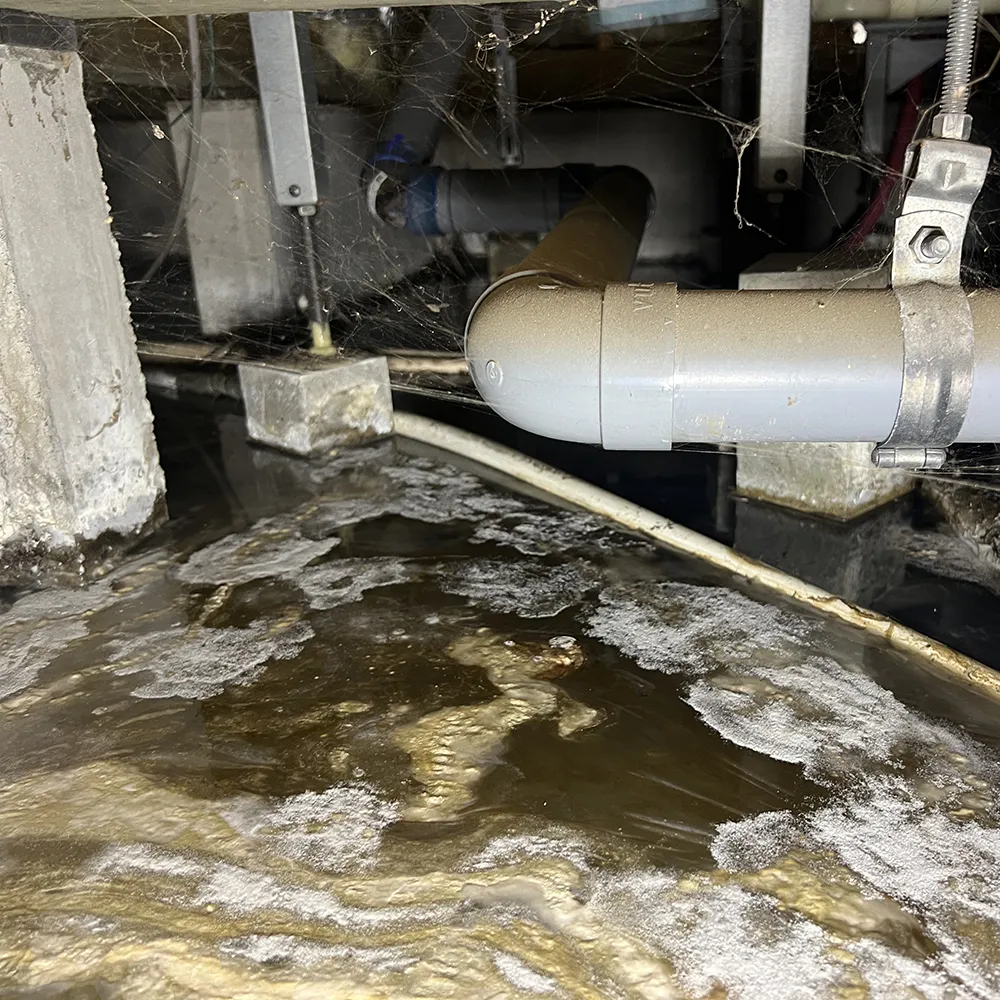 現地調査では、床下全域に汚水が広範囲に滞留していることを確認。