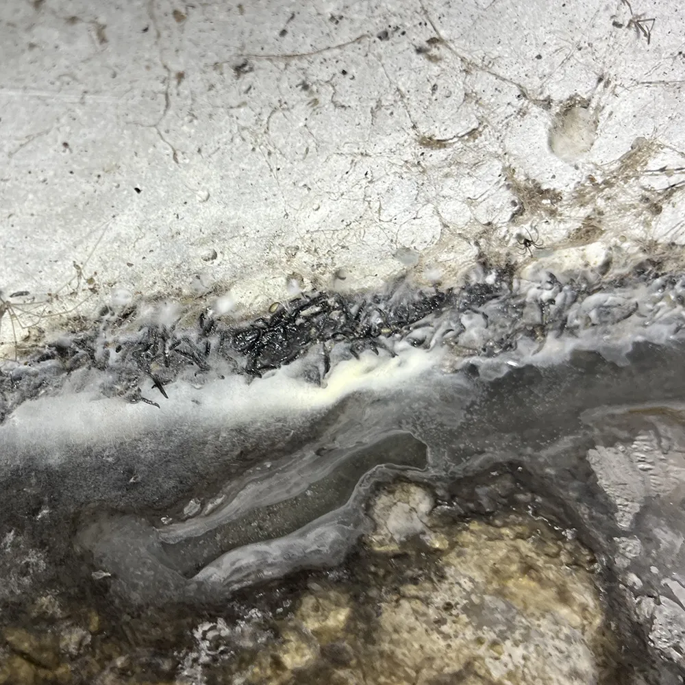 本事例は、キッチン排水漏れによって汚水が床下へ流入し、油の塊や食品カスが大量に堆積・腐敗していたケースです。