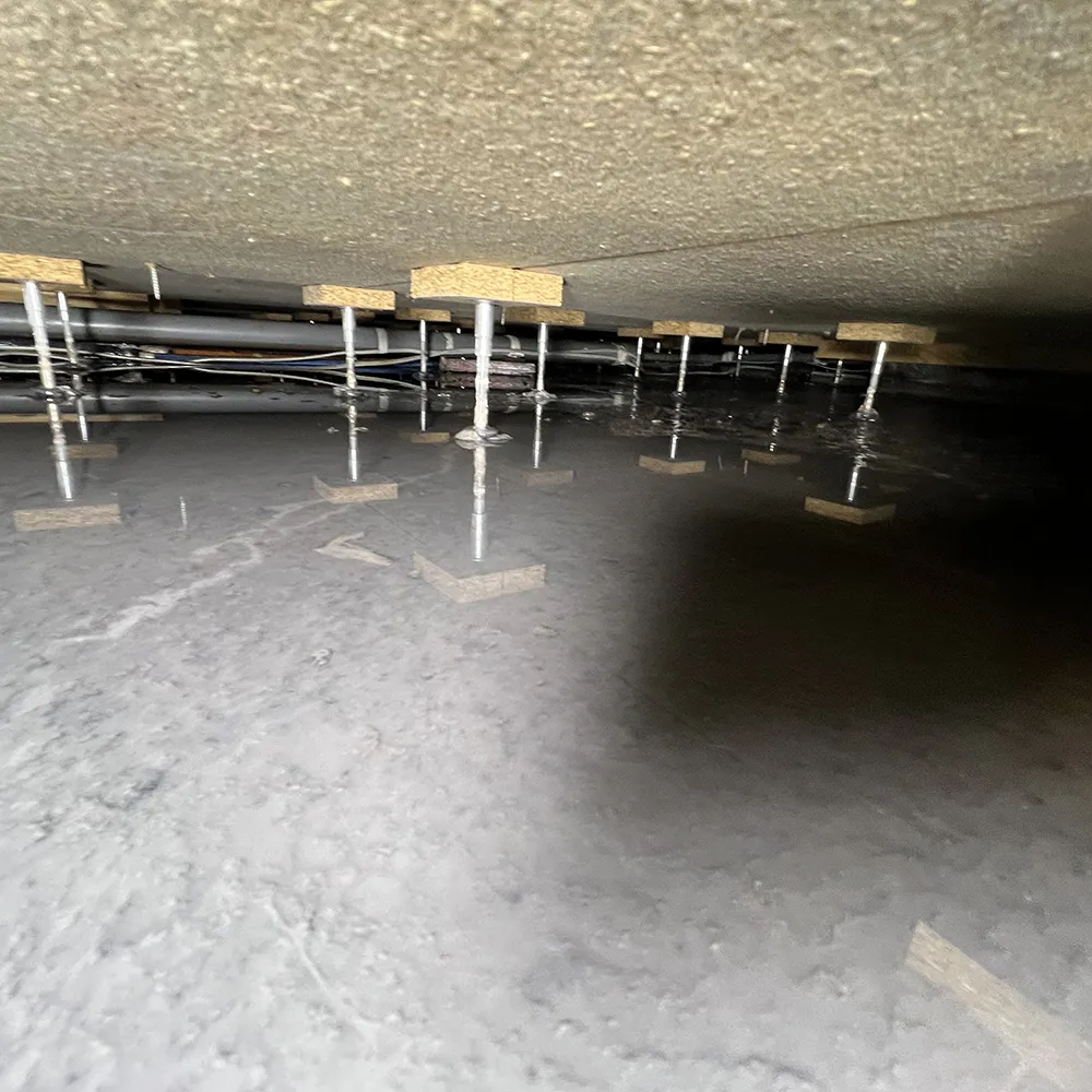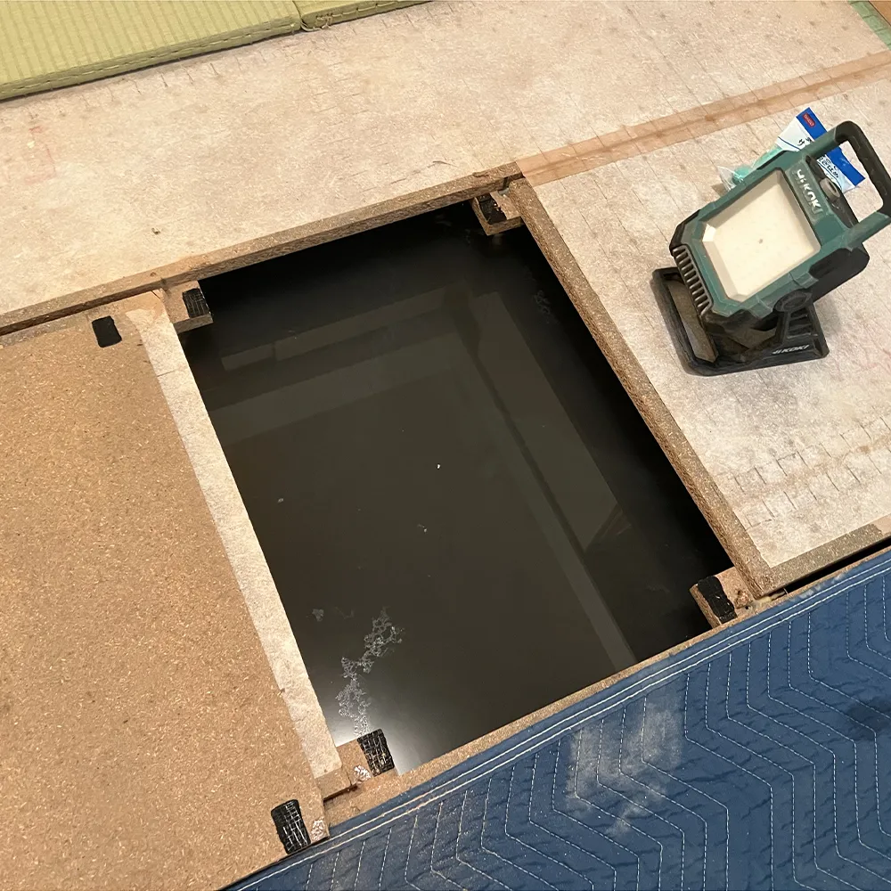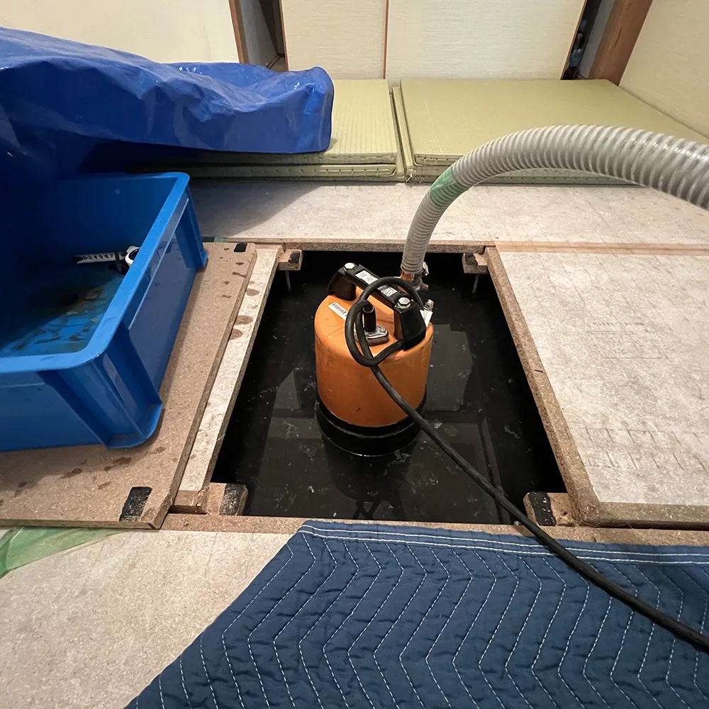 床下の浸水範囲・臭気・害虫発生状況を確認し、写真記録と含水率などの各種計測を実施。必要に応じてポンプによる応急排水を行い、復旧方針とお見積りをご提示します。