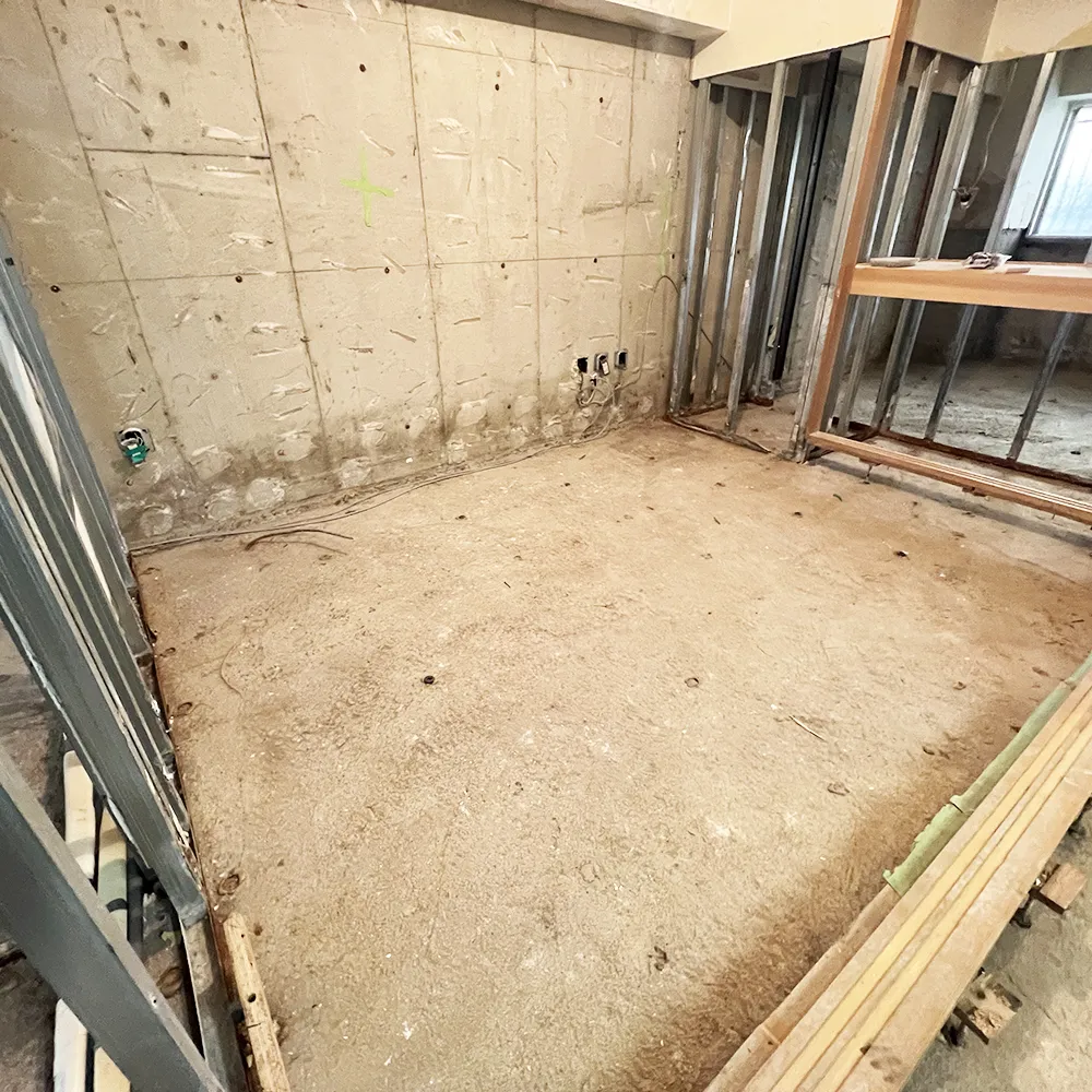 汚染状況に応じて床材や壁を解体。カビ被害の進行した建材は撤去し、適切な復旧作業が行える状態を整えます。