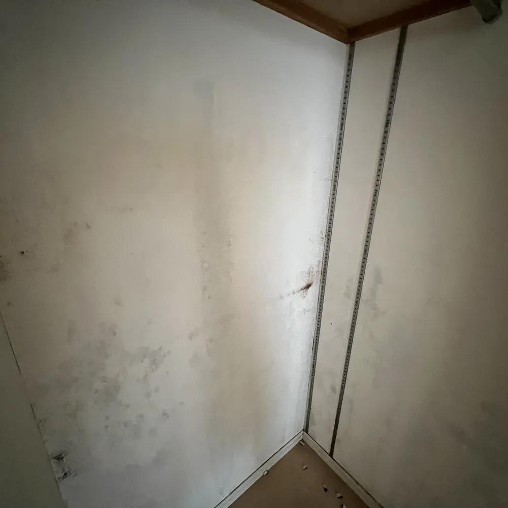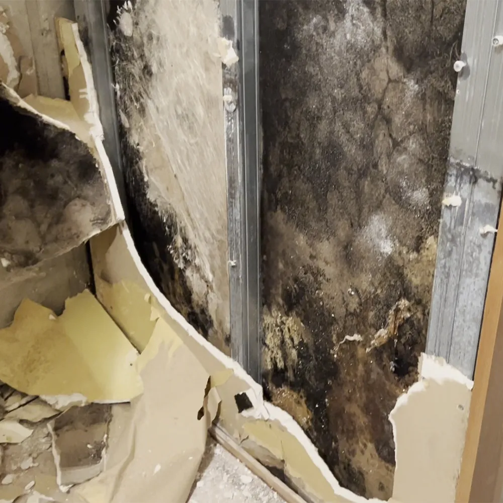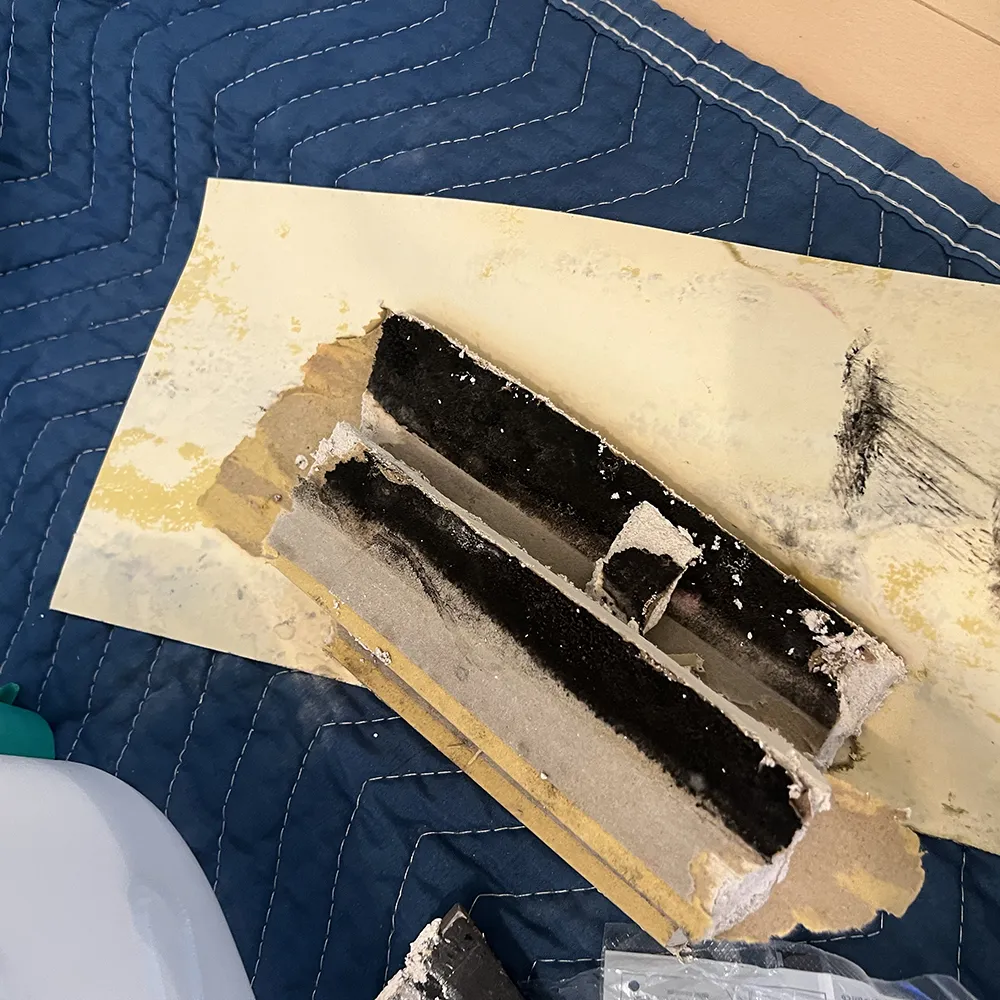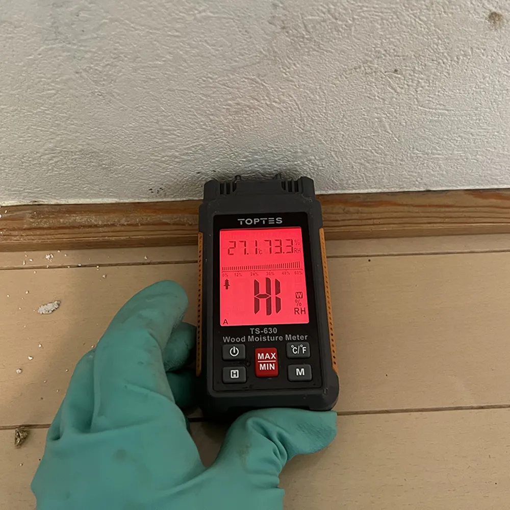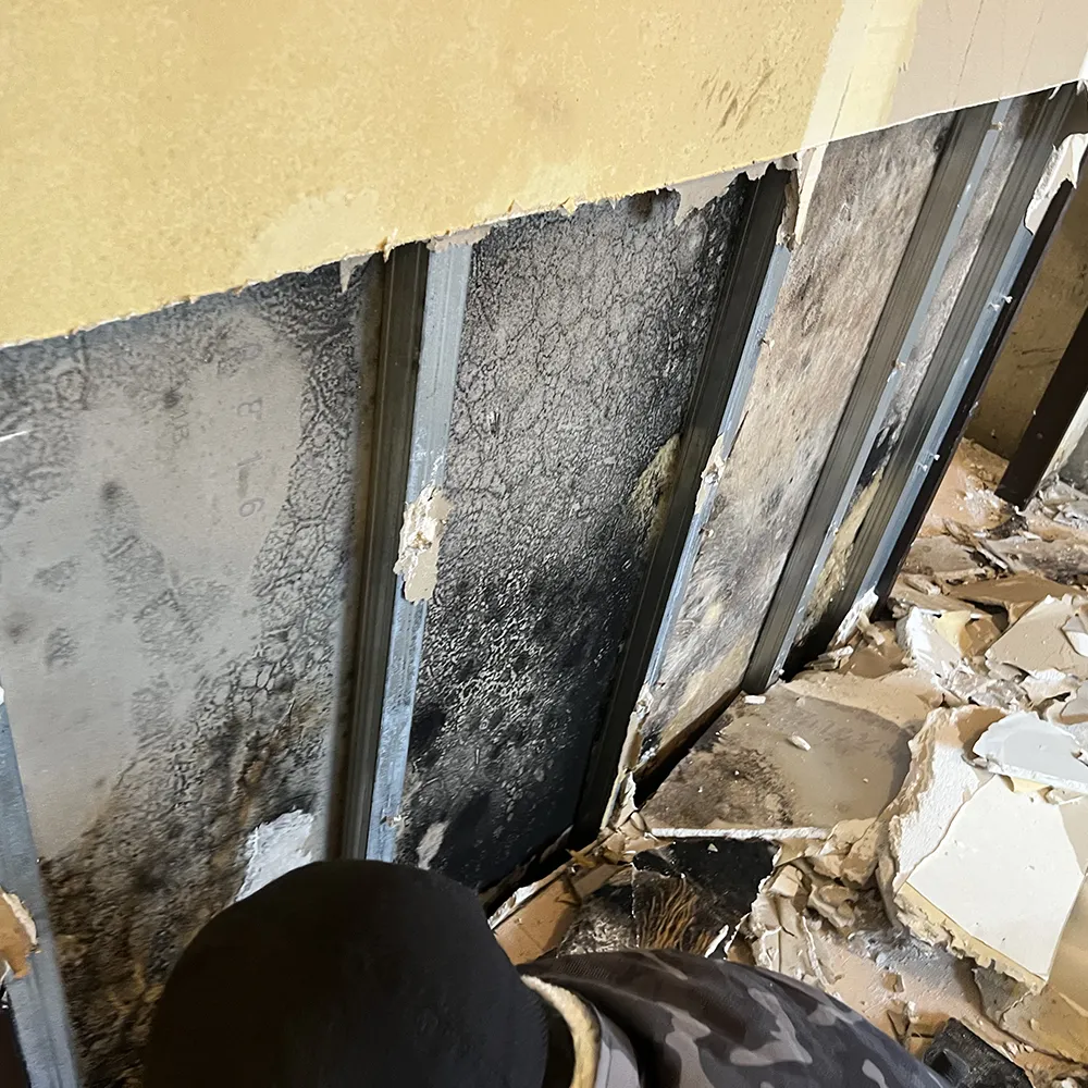 A. 漏水期間が長かったため湿気が壁内部まで回り込み、含水率測定で50%以上(Hi表示)という異常値を確認しました。実際に壁を開口すると内部は広範囲にカビが発生しており、衛生面と再発防止の観点から、カビ被害箇所の解体・交換が必要と判断しました。