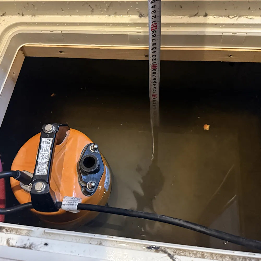A. 排水前の水位計測は、被害の客観的証拠を残すために行っています。 火災保険(水災補償)の申請では、浸水の深さ・範囲を示す 写真や記録が重要になるため、ポンプ排水の前に必ず実施しています。