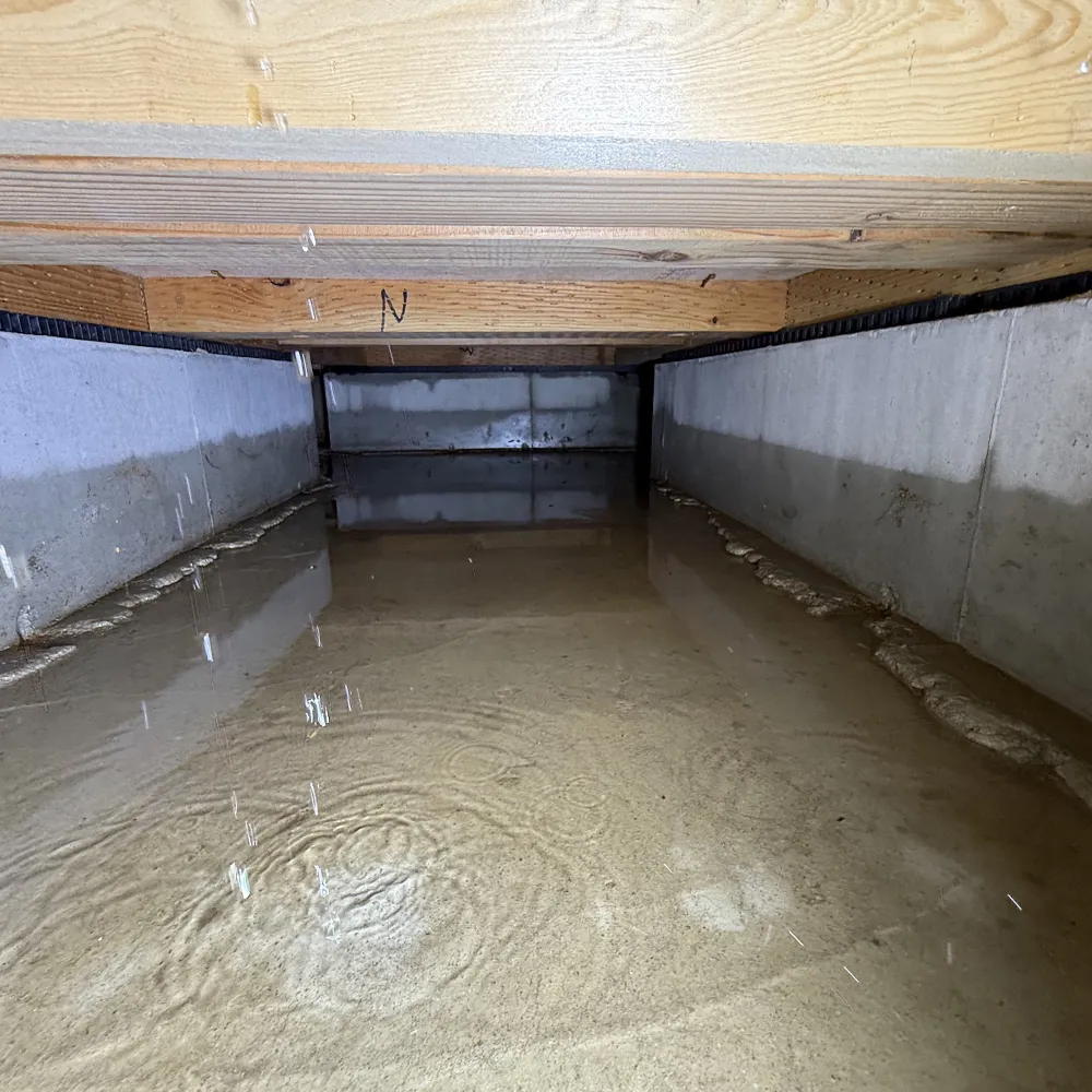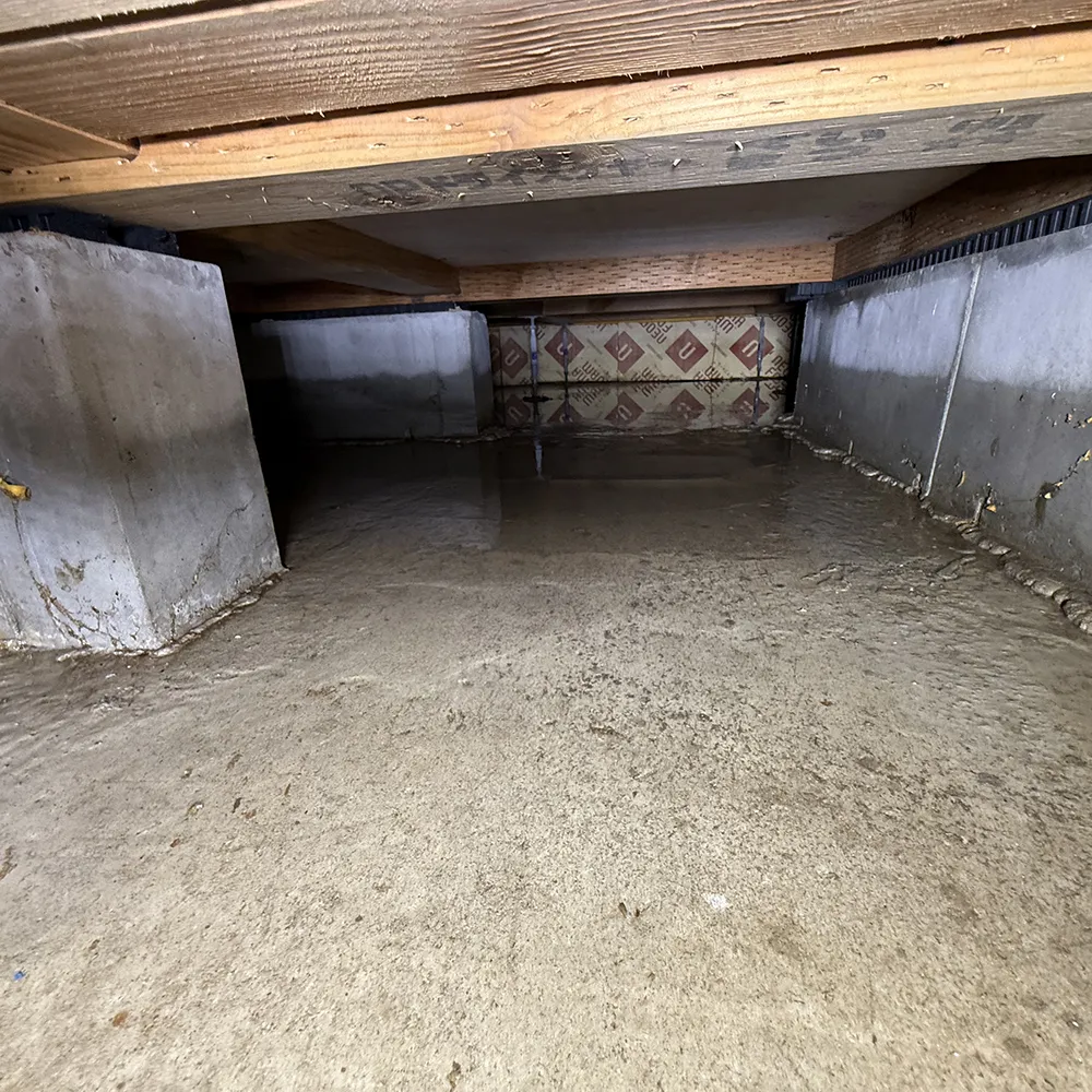 床下点検口から内部を確認したところ、床下全域にわたり雨水が滞留しており、基礎立ち上がり部やコンクリート床面には明確な浸水痕を確認。