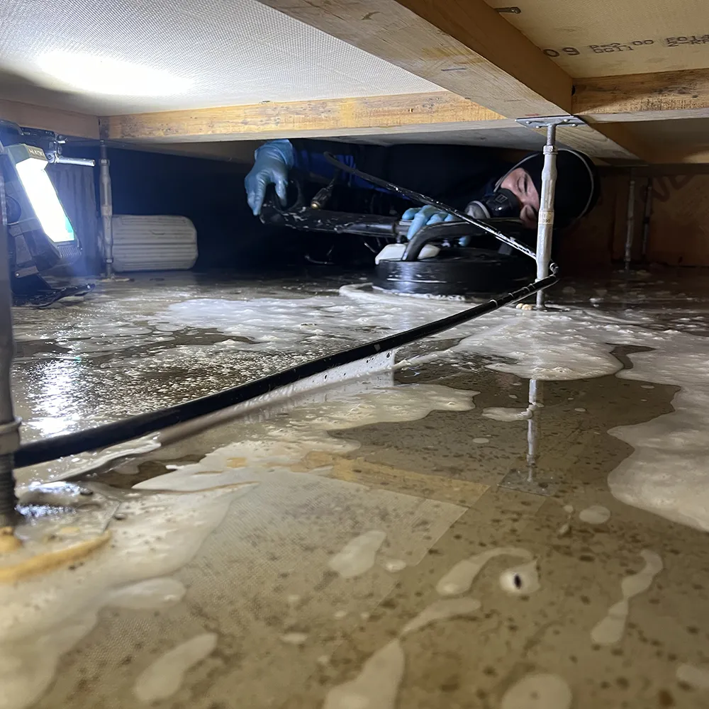 特殊バイオ洗浄液を使用して床下全体を洗浄。汚物や臭気成分を分解・除去し、落ちにくい箇所は手作業のブラッシングで細部まで徹底的に清掃します。